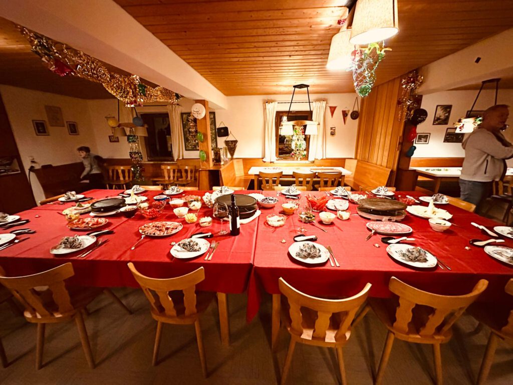 Nach dem traditionellen Einstimmen mit „Dinner for One“ ging es an das liebevoll vorbereitete Raclettebuffet. In geselliger Runde verging die Zeit wie im Flug, sodass das Öffnen der Champagnerflaschen zum Jahreswechsel gerade noch rechtzeitig erfolgte. Während die Damen die Gläser füllten, sorgten einige engagierte „Brandstifter“ draußen für die Vorbereitung des Feuerwerks.
